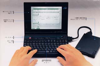 このPC,なんと単3電池6本で動くのよ。画期的!CPUも80386(でもSLの16MHz)だし、Windows3.1も動くし、HDDも載ってる!(80MBだけど)、メモリも6MBさ!これで脱PC98!!